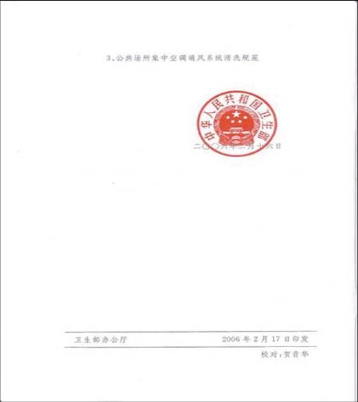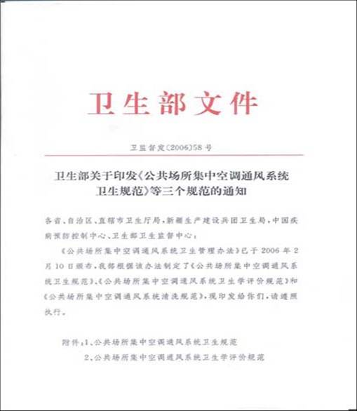 2003年至今国家有关部门先后下达《空调通风系统清洗规范》、《空调通风系统运行管理规范》和《公共场所集中空调通风系统卫生管理办法》,规范空调通风系统的清洗。
